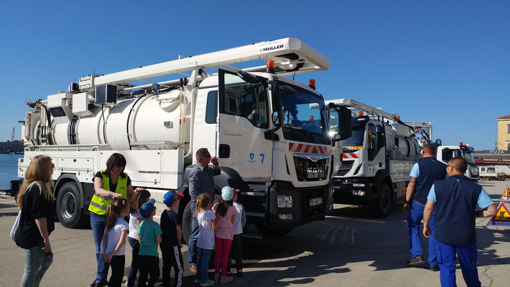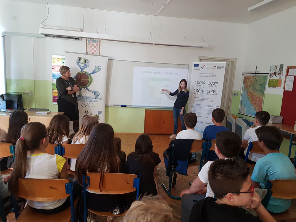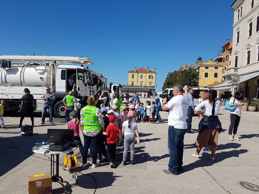 Dan planeta Zemlje, 22. travnja 2018.g., obilježen je brojnim događanjima organiziranim diljem svijeta s ciljem da nas podsjete na potrebu zaštite okoliša i očuvanja prirodnih izvora te skrenu našu pozornost na prijetnju životu na Zemlji uslijed porasta globalnog onečišćenja. Odvodnja Rovinj Rovigno d.o.o. pridružila se obilježavanju Dana planeta nizom promotivno-edukacijskih događanja kojima je upozorila na važnost vode, prirodnog resursa bez kojeg nije moguć život na našem planetu. Pojmovi odvodnje i pročišćavanja otpadnih voda približeni su vrtićkoj djeci i mlađim osnovcima, a srednjoškolci su upoznali glavne značajke Projekta prikupljanja, odvodnje i pročišćavanja otpadnih voda na području aglomeracije Rovinj. U četvrtak 19. travnja 2018. za učenike 2.– 4. razreda osnovnih škola Vladimira Nazora i Jurja Dobrile organizirane su tri interaktivne radionice u trajanju od po 45 min na kojima su na jednostavan i zabavan način, kroz zgode i nezgode kornjače Hrvoja, razvijali svijest o važnosti vode, njenog očuvanja i zaštite te usvajali osnovne pojmove vezane uz prikupljanje, odvodnju i pročišćavanje otpadnih voda. Radionice, na kojima je ukupno sudjelovalo oko 130 učenika u pratnji nastavnika, organizirane su u suradnji Odvodnje Rovinj i Službe za odnose s javnošću Hrvatskih voda. Nakon slikovne prezentacije i razgovora, djeca i škole dobili su na dar slikovnice Hrvatskih voda o temama zaštite voda i odvodnje. U petak 20. travnja 2018., u razdoblju od 9:15 do 11.30 sati Trg Matteotti u Rovinju preplavila su djeca iz vrtića „Neven“ i talijanskog vrtića „Naridola“. Ukupno tristotinjak dječjih posjetitelja dolazilo je na Trg u skupinama, u pratnji odgajateljica, prema unaprijed utvrđenom redoslijedu. Na Trgu su ih dočekivali predstavnici Odvodnje Rovinj uz izloženu opremu i vozila za čišćenje i održavanje kanalizacije čija je nabavka sufinancirana sredstvima EU-a. Uz pjesmu, ciku i viku, mnogo uzbuđenja i znatiželje, djeca su ulazila u vozila, upoznavala opremu, rukovala robotom sa kamerom i promatrala unutrašnjost cijevi na monitoru. Sa sobom su donijeli crteže koje su izradili pripremajući se za posjet i koje su vrijedne odgajateljice štipaljkama za rublje pričvrstile na konop koji su u tu svrhu nategnule na Trgu. Na informativno-promotivnom štandu Projekta bile su za djecu priređene bojanke i zadaci na temu vode, odvodnje i pročišćavanja, a za osobe u njihovoj pratnji promotivni materijali projekta. Nakon završetka dječje posjete, izložene strojeve i opremu mogli su do 12 sati razgledati građani. Istog dana, u vremenu od 12:30 do 13:15 sati, u učionici Srednje škole Zvane Črnje održan je uvodni susret sa srednjoškolcima sa svrhom predstavljanja Projekta rovinjske odvodnje i pročišćavanja u ozračju obilježavanja Dana planeta Zemlje. Uz učenike škole domaćina sudjelovali su i učenici Talijanske srednje škole / Scuola media superiore Italiana,. Riječi dobrodošlice, uz podsjećanje na odgovornost prema planetu Zemlji, uputio im je prof. Željko Balog. U središnjem dijelu programa Projekt je prezentirala predstavnica Odvodnje Rovinj, Sanja Bokun. Slijedila su pitanja i odgovori, najvećim dijelom vezani uz način pročišćavanja i izgradnju uređaja. U završnom dijelu susreta, prof. Daniele Suman prikazao je rezultate projekta istraživanja morskih organizama u blizini mjesta ispusta koje je provedeno prije nekoliko godina. Sudjelovalo je četrdesetak srednjoškolaca.